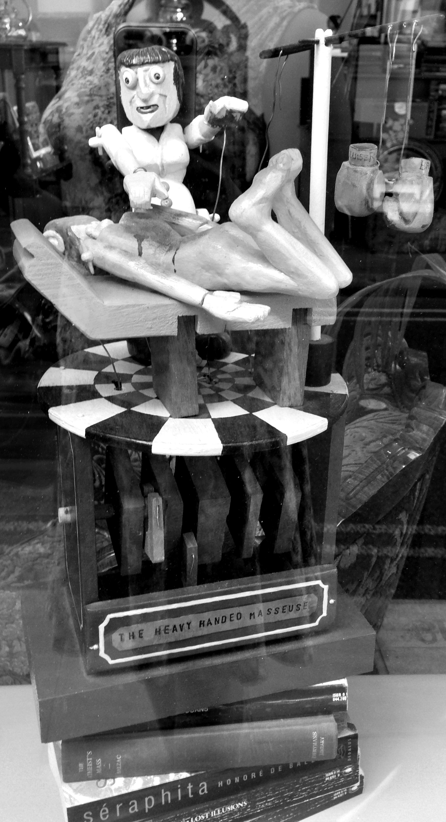 The Turner Contemporary gallery in Margate, on England’s Kent coast, is currently showing an exhibition entitled “Curiosity”. Many of the shops around the old town are supporting that exhibition by showing something “curious” in their windows. A tea shop, of all places, was displaying some rather macabre wooden toys and automata. This one caught my eye and its theme seems to make it a perfect subject for black and white.