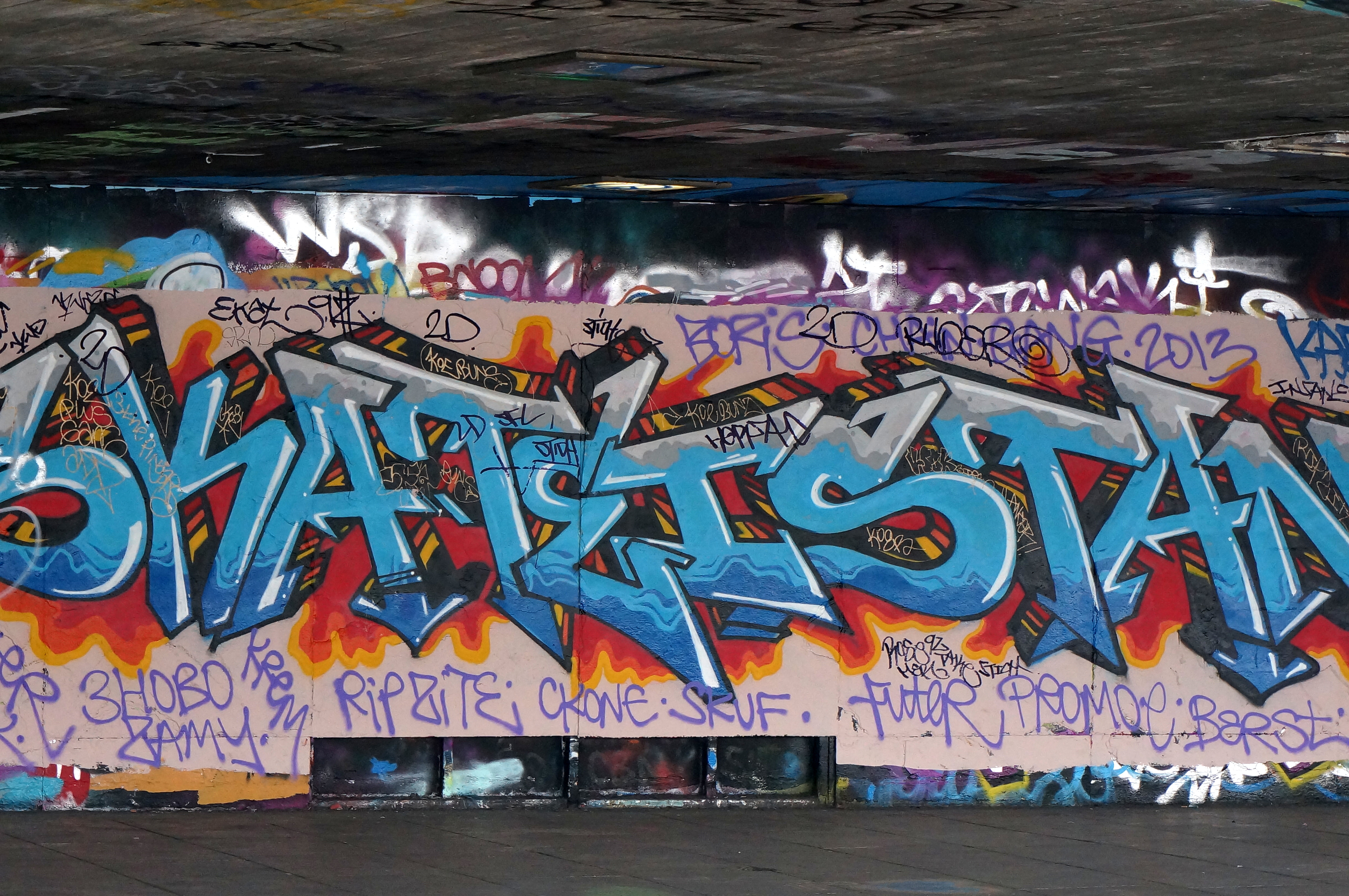 On the South Bank of the Thames, in the undercroft of the Queen Elizabeth Hall, there is a lively street skating venue. Decorated with bright graffiti, it is more than a skate park, it is more of a living art installation.