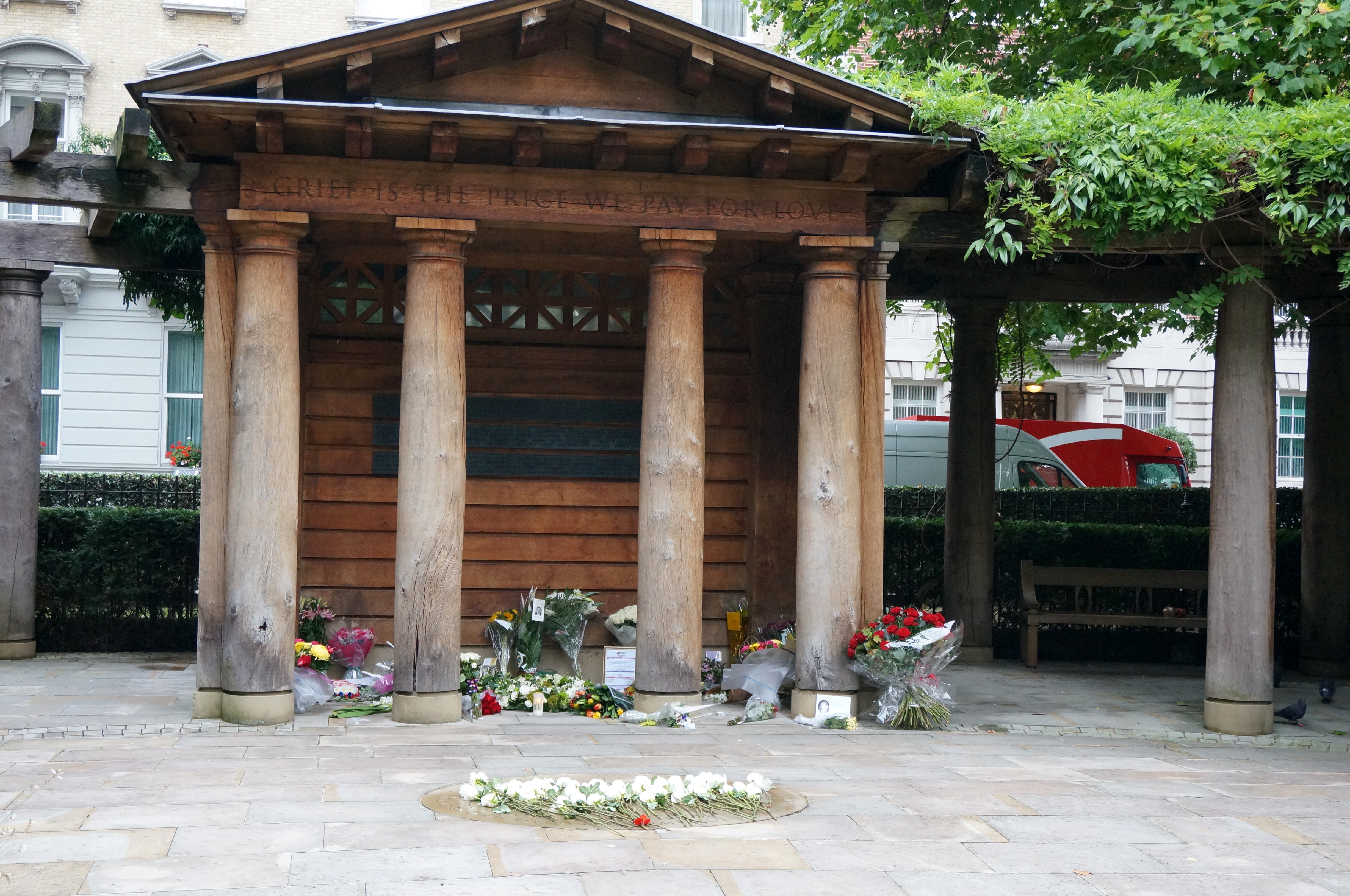 The central plaque is dedicated to the Britons who were killed in the attacks on the World Trade Centre and the Pentagon. This is surrounded by an oak pergola and pavilion which bears the words: “Grief is the price we pay for love”, part of a message from the Queen read out at a New York remembrance service one week after the attacks.