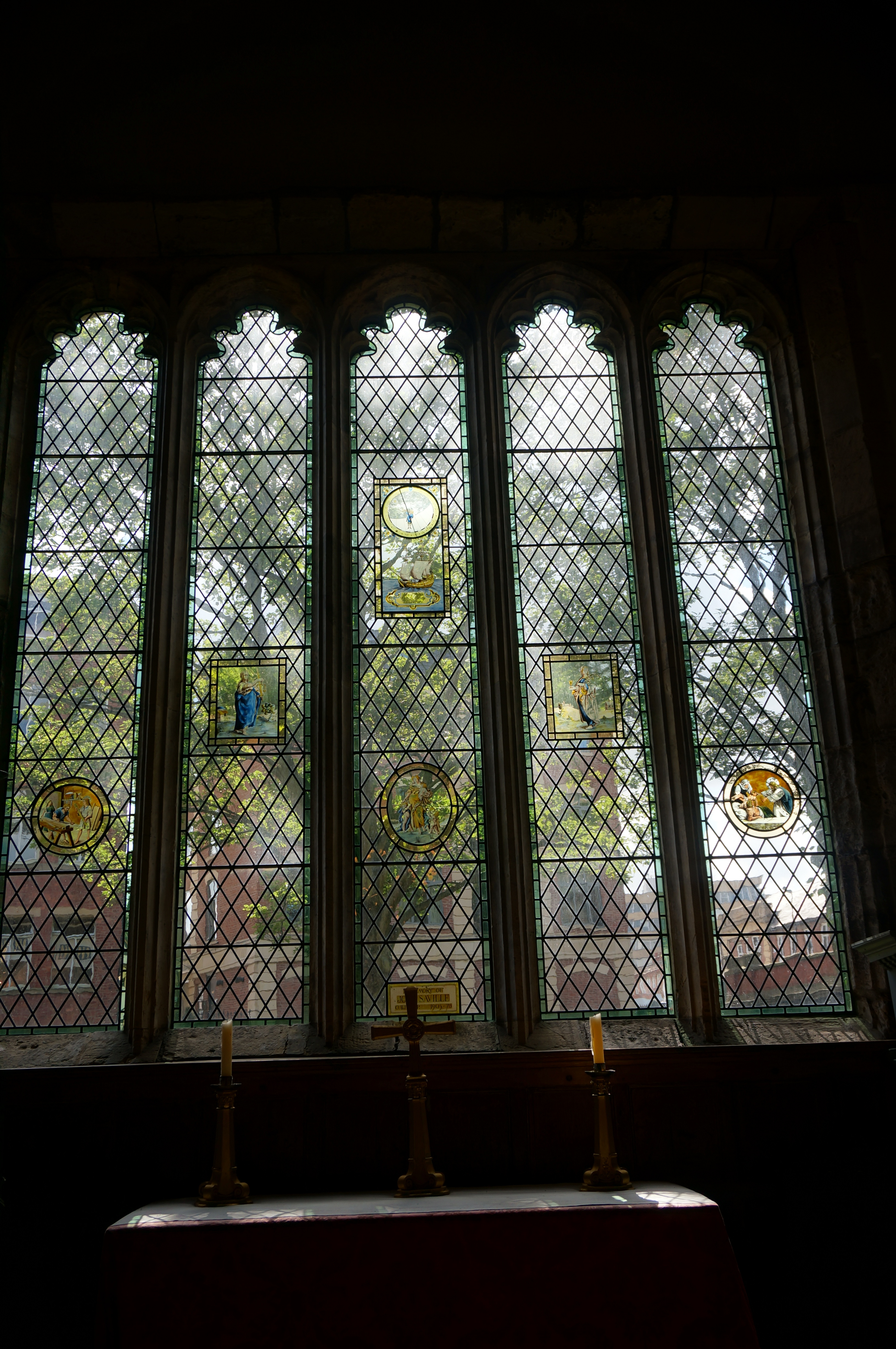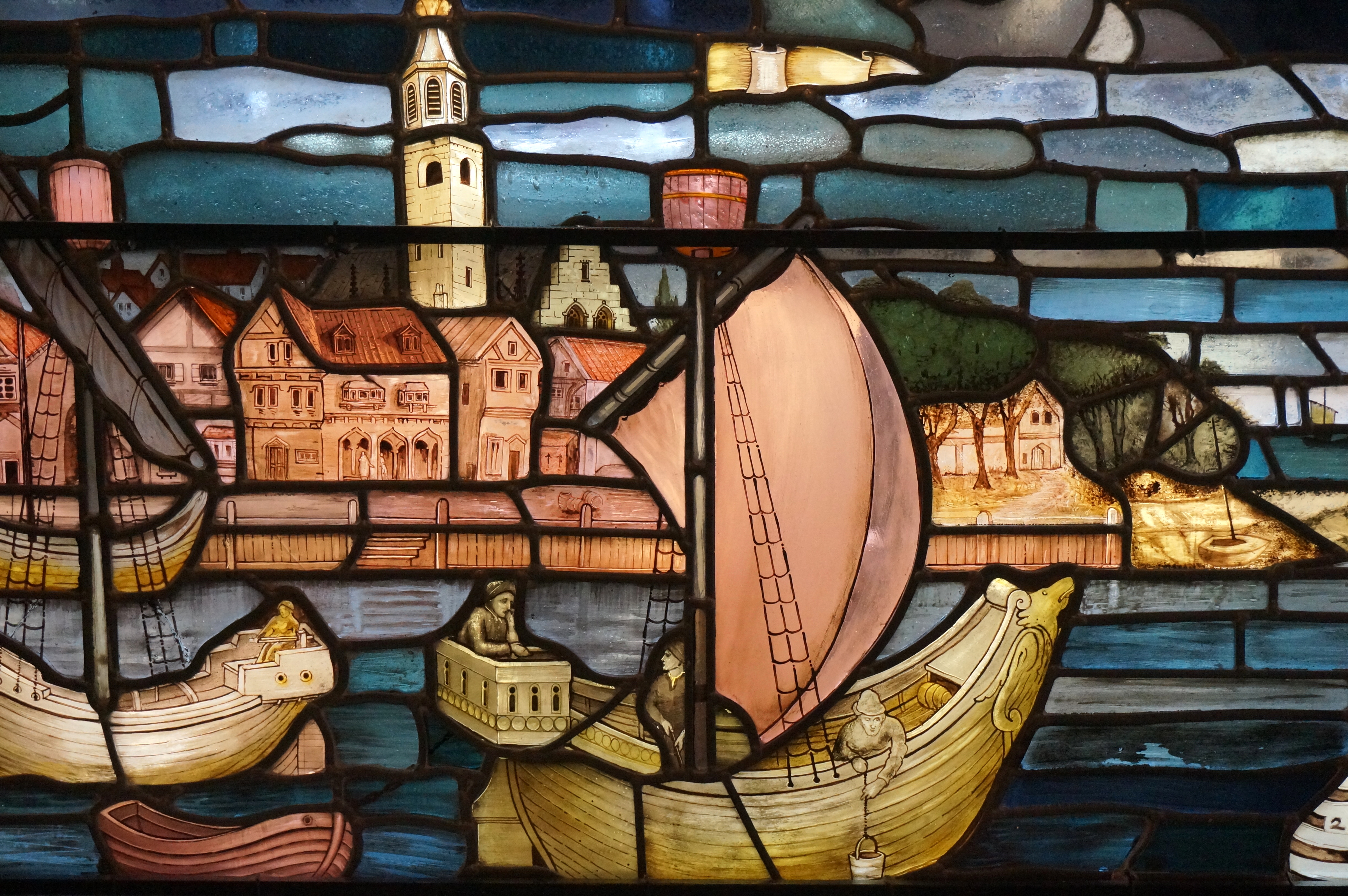 There are also some beautiful modern stained glass windows. The two below depict buildings and activities on York’s quayside:
