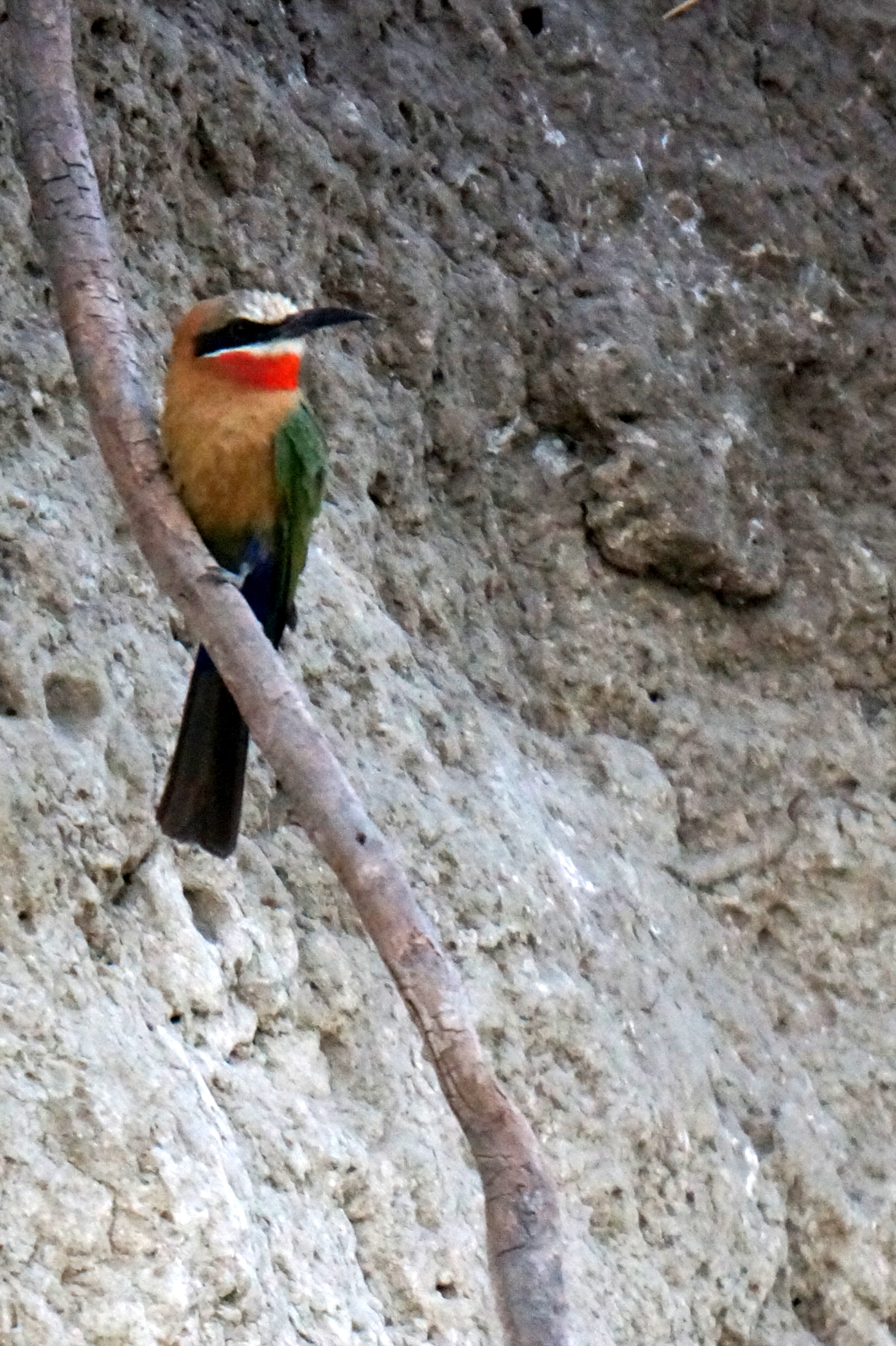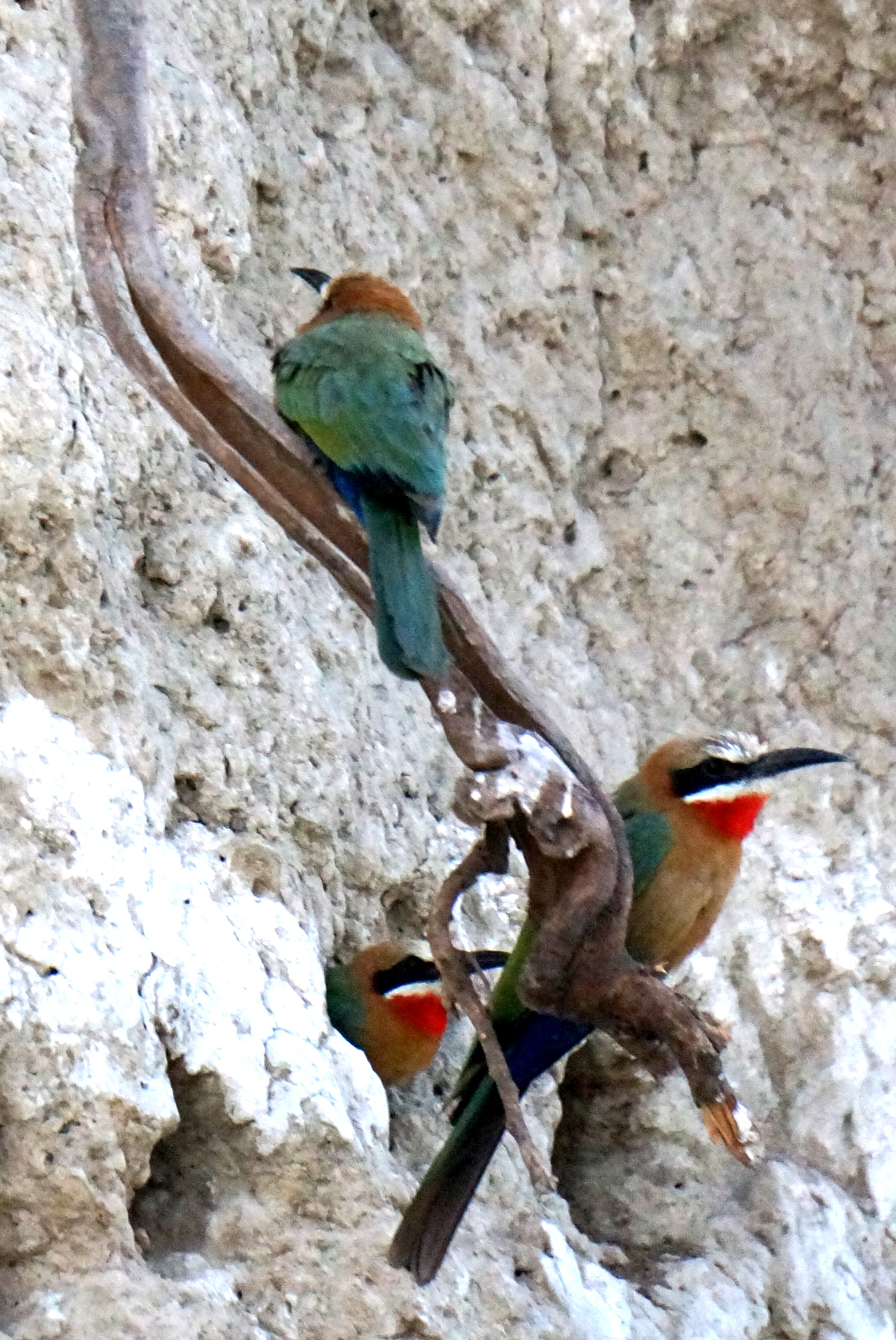 There are many species of bee-eaters, all beautiful; these white-fronted bee eaters have a distinctive white forehead, a square tail and a bright red patch on their throat. They have a complex social structure, nesting in small colonies on river banks or cliff walls. These colonies are composed of clans of two or three pairs, their helpers, and offspring.