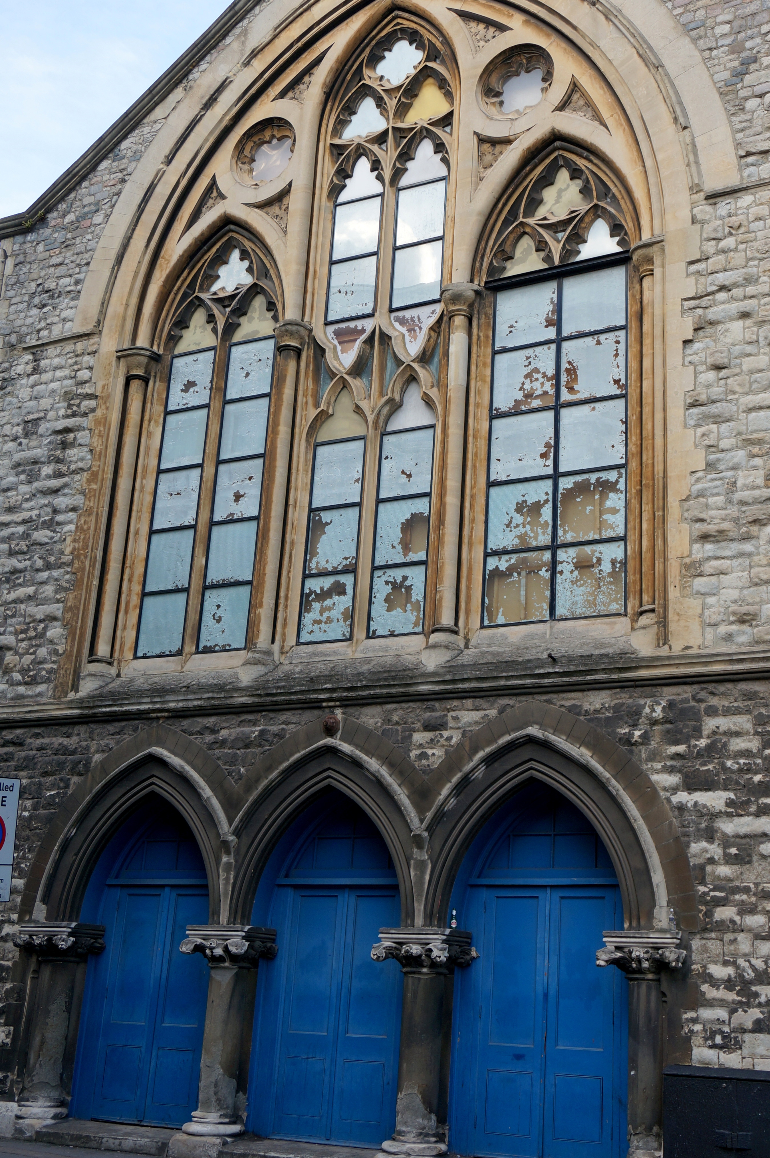 The other day I had just stopped for a quick coffee (ok, and a cake…) and was dashing to a meeting near Old Street Station when I stumbled across these blue triplets. They belong to the former Whitefield’s Tabernacle (also known as Moorfields Tabernacle) on the corner of Tabernacle Street and Leonard Street. A spot of research reveals that the first church on this site was a wooden building erected by followers of the evangelical preacher George Whitefield in 1741. This was replaced by a brick building in 1753. John Wesley preached a sermon here entitled “On the death of the Rev Mr George Whitefield”. The church was rebuilt in stone and in Gothic style over a century later in 1868. The foundation stone of the 1868 building reads: “Near this spot stood the Tabernacle built by the Rev. George Whitefield in 1753: 115 years afterward it was taken down and in its place this building was erected.”