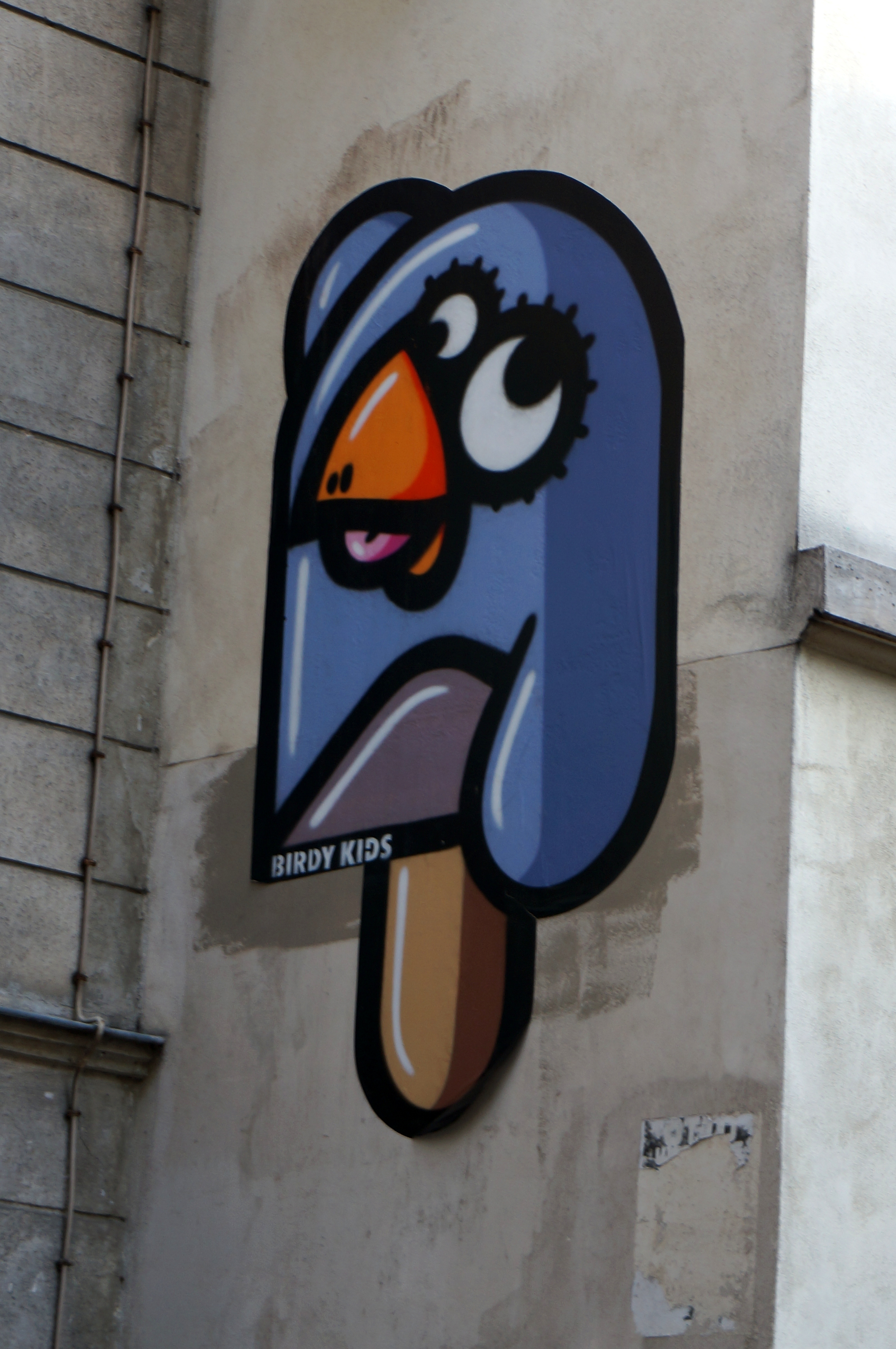 The artist Knar and his 2 collaborators, Birdy Kids, have been making the bright and cheerful bird graffiti since 2010, particularly in Knar’s home town of Lyon. The blue bird pictured above is one of several in Le Marais.