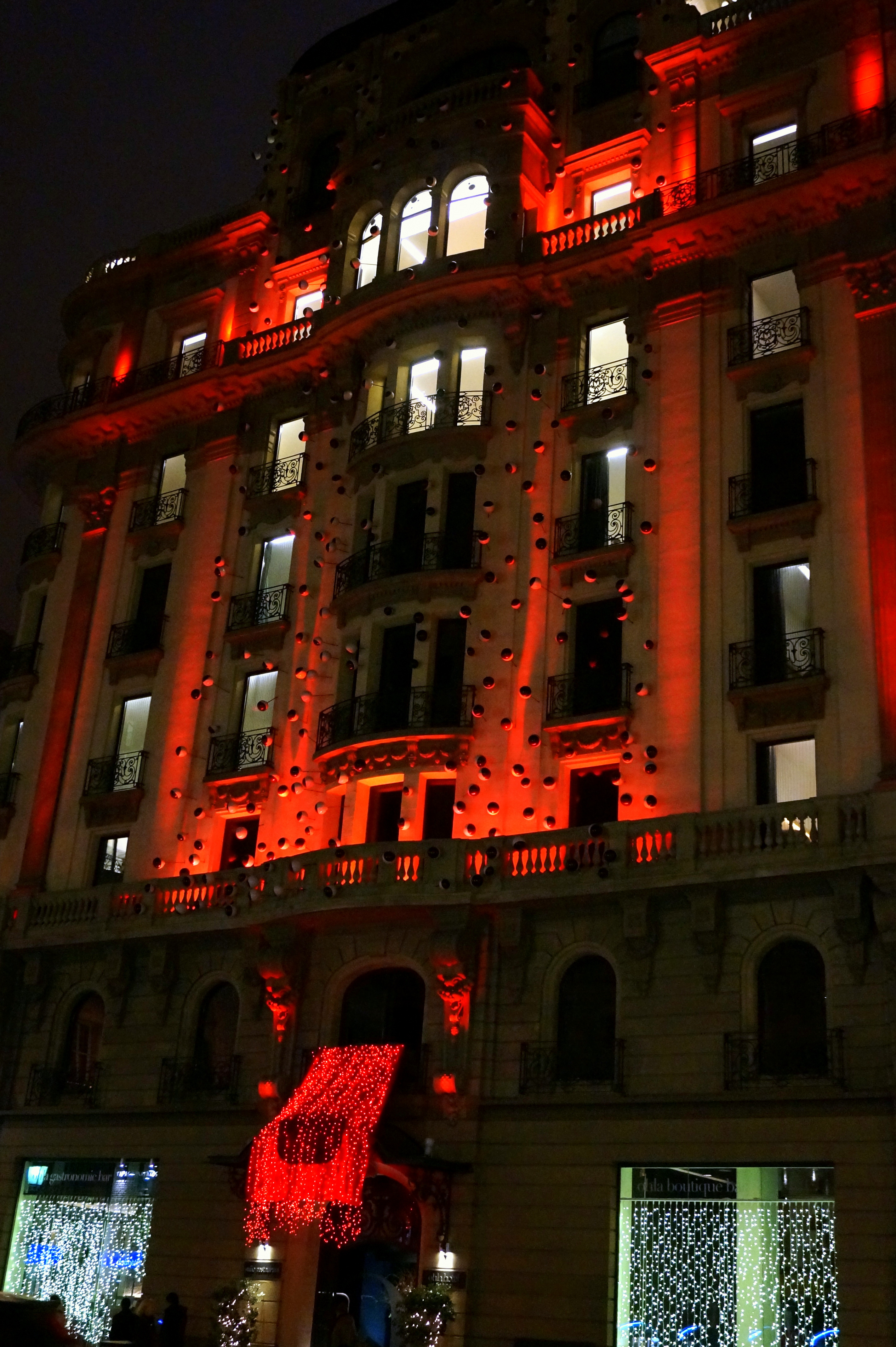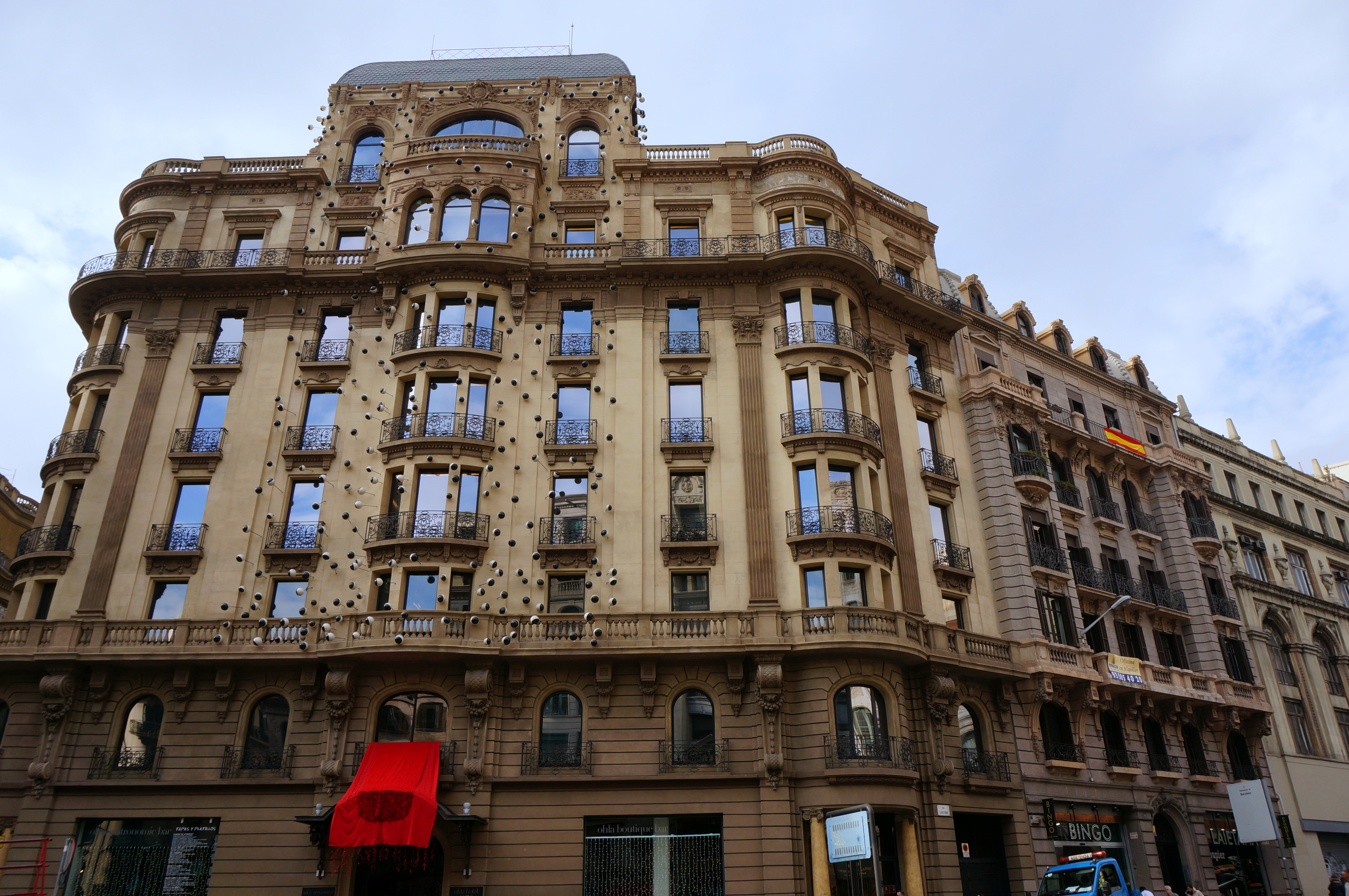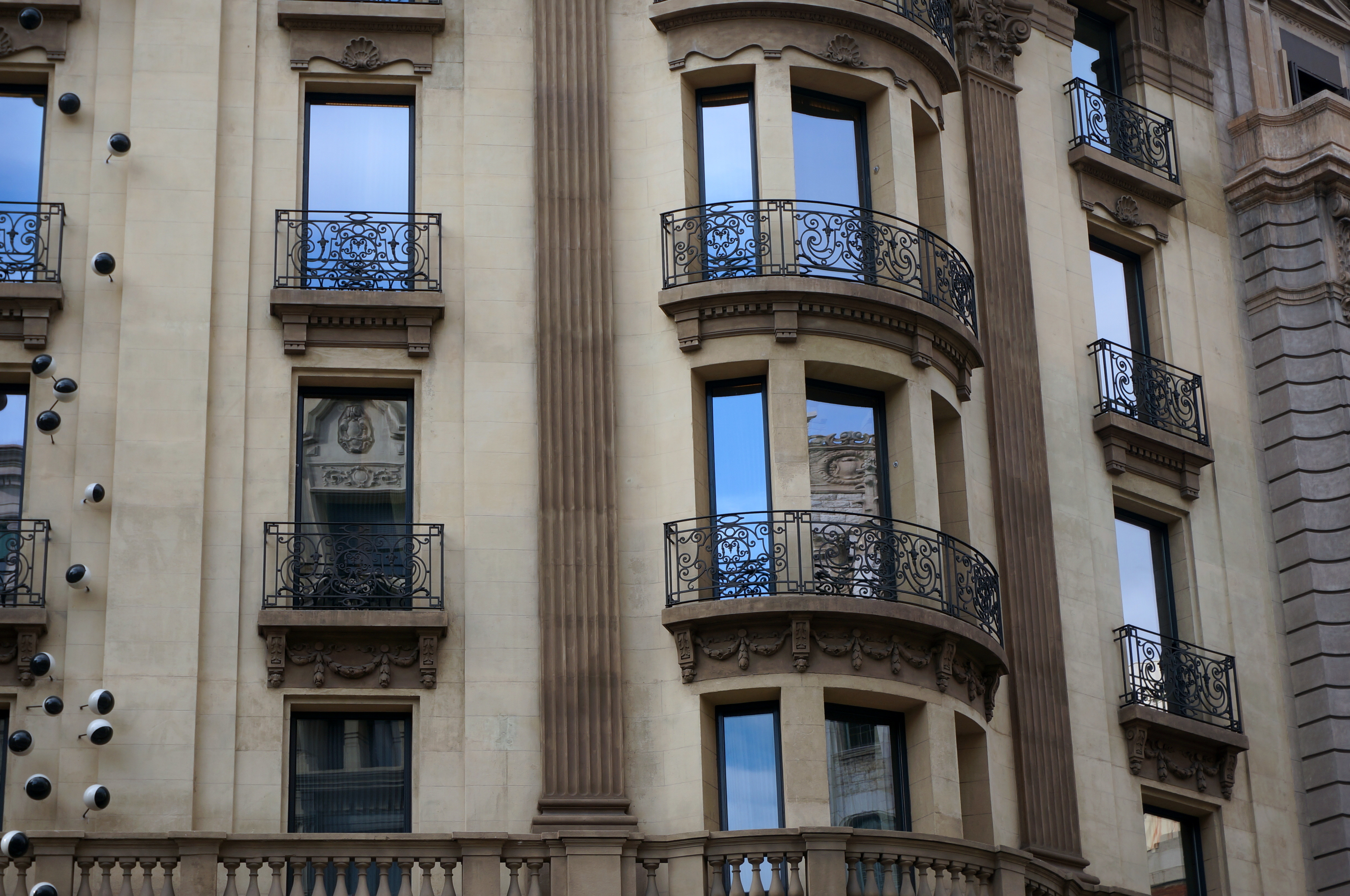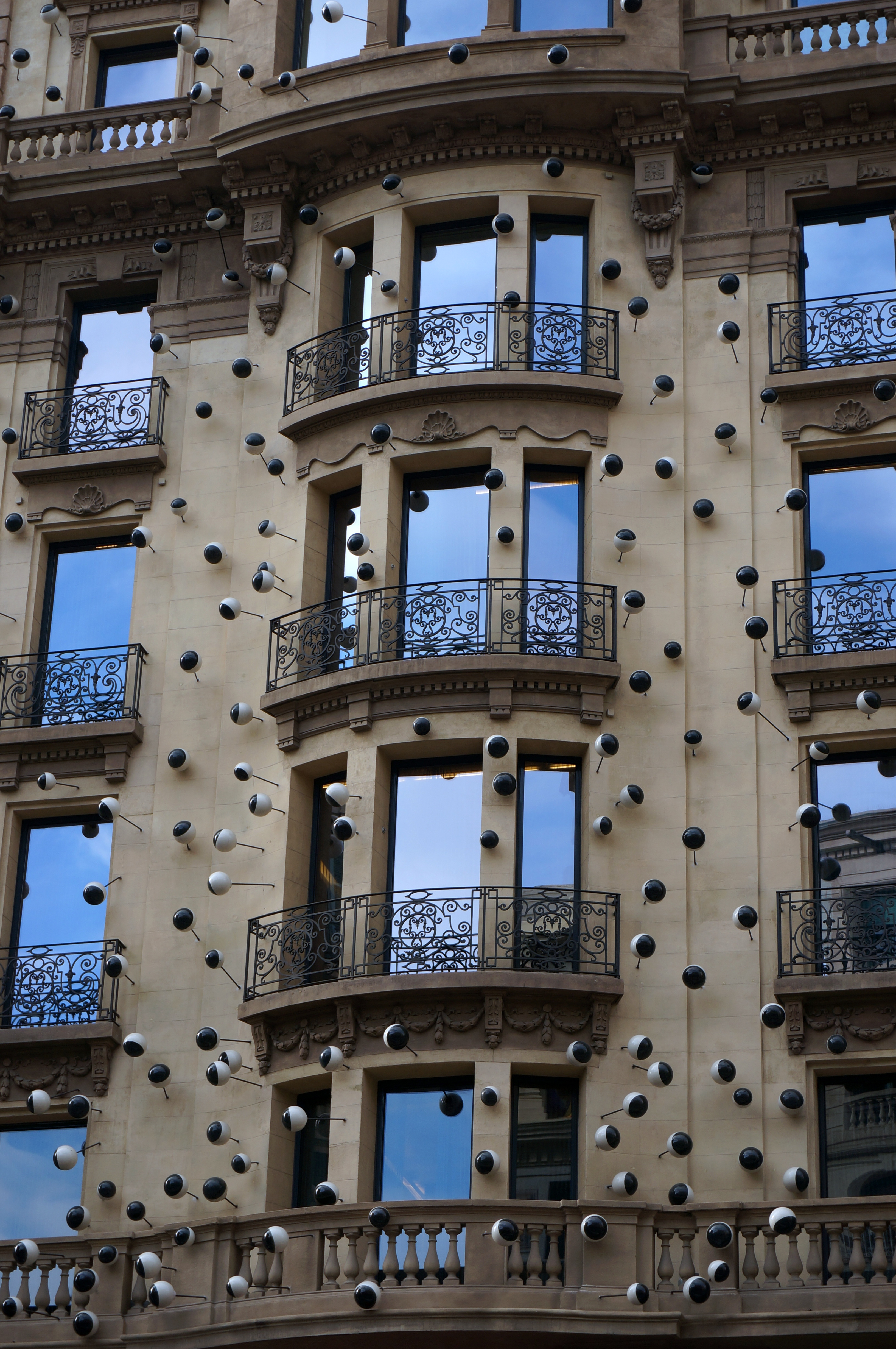 These particular fenestrations belong to a neo-classical building, built on the site of the former palace of the first Count of Barcelona.  Previously a furniture shop, the building was renovated a couple of years ago and is now home to a boutique hotel.  The historical facade contrasts with the modern eyeball-like spheres that adorn it, a sculptural work by artist and sculptor Frederic Amat.