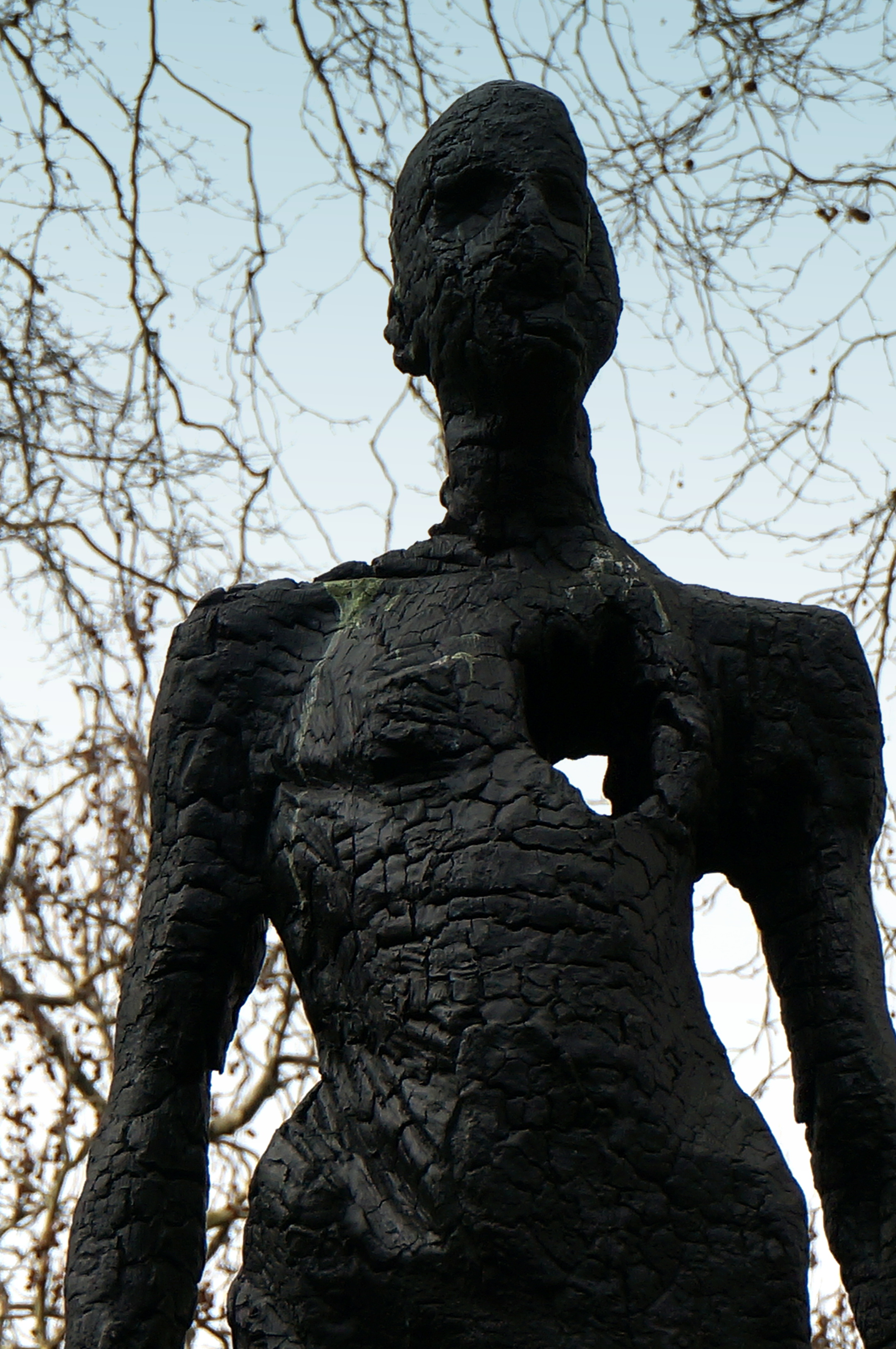 The figure, with a hole in his chest, appears to be made of wood and is seemingly growing out of a tree trunk. It is, in fact, carved from wood, then burned and finally cast in bronze.