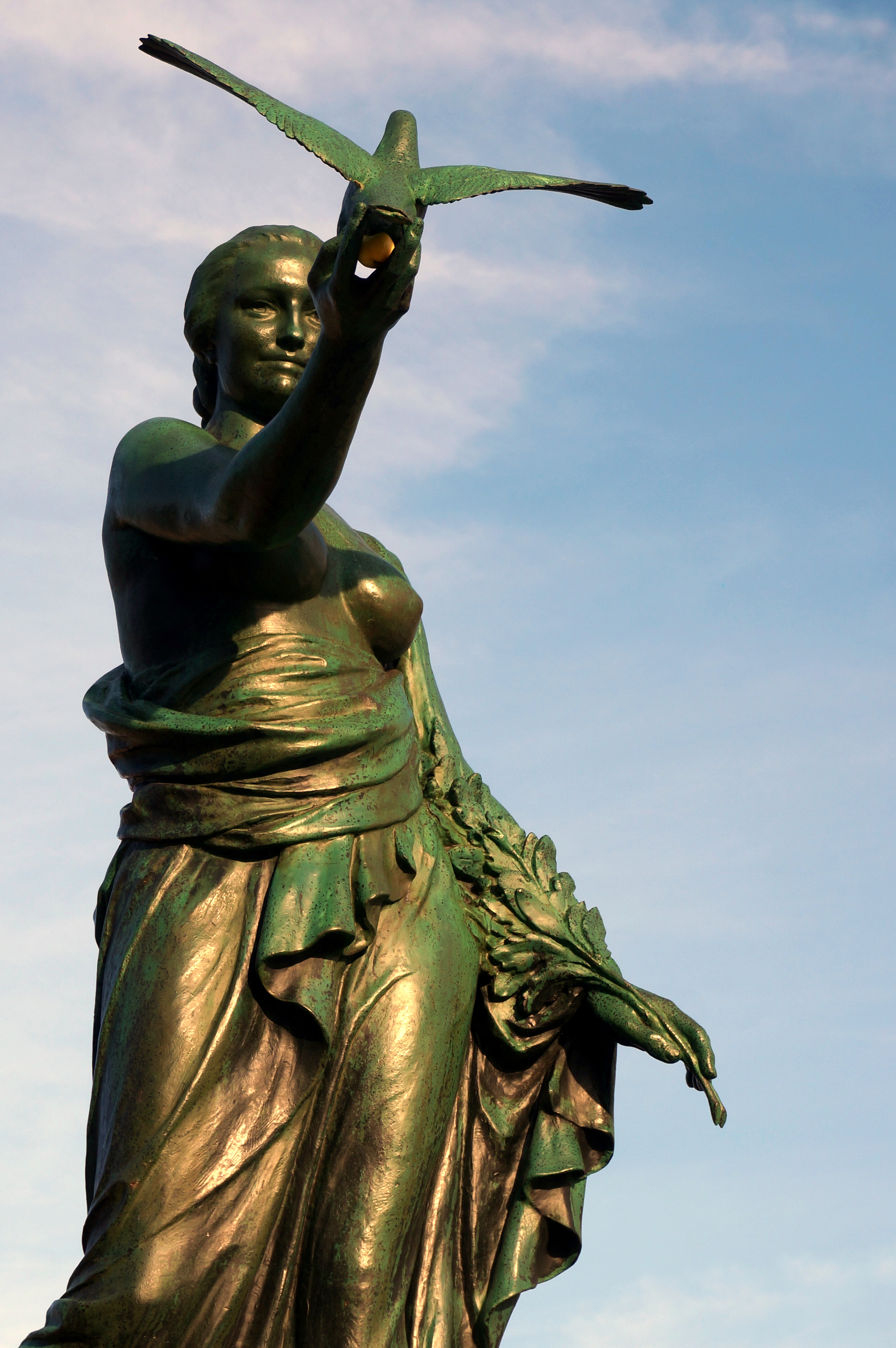 This famous patriotic pigeon, together with its fellow pigeon soldiers and their supporting pigeon fanciers, served Belgium during World War I. This statue by Victor Voets, with its female figure representing the gratitude of the nation, was unveiled in March 1931 in honour of the pigeons, as well as the pigeon fanciers, who gave their lives between 1914 and 1918. Belgium has a very strong tradition of racing pigeons which may explain why they have commemorated this aspect of animal war service in such a grand manner.