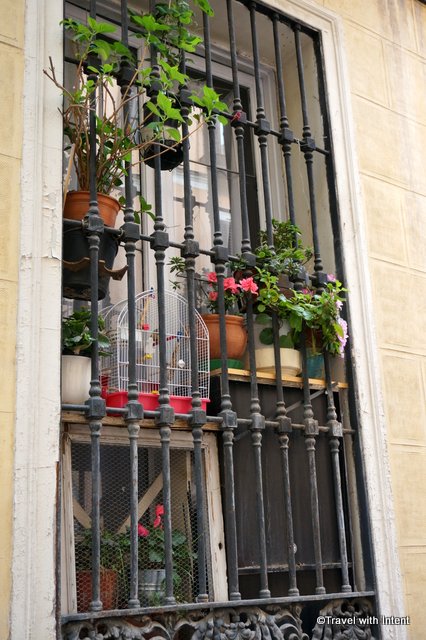 I know I’m in Spain when I can hear bird song coming from balconies. These windows in Malasaña had birds, and flowers too.