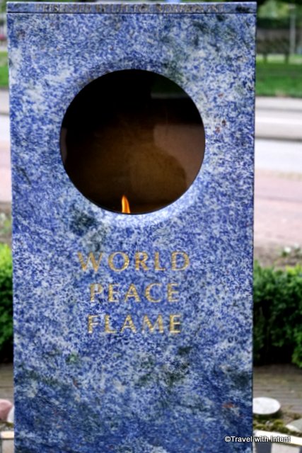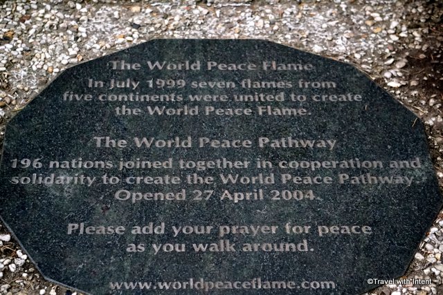 In July 1999 seven flames from five continents were united to form the World Peace Flame. Then in April 2004, a World Peace Pathway was built around it – each independent country in the world (196 of them) contributed a stone to the path, with the aim of reminding us all that world peace is the responsibility of each one of us.