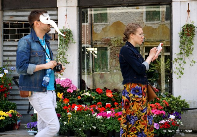 Venice has some beautiful florist shops dotted around town. This tourist has gone for a flower power camouflage approach on her bottom half; her companion has gone more for the stand-out-in-a-crowd option.