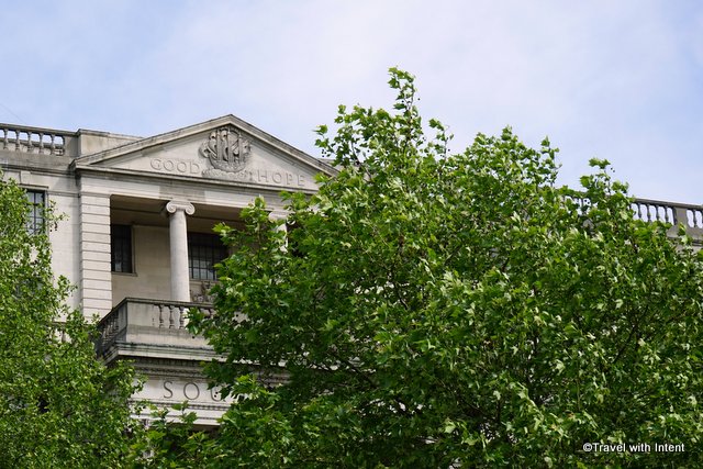 I particularly like this message, high above the High Commission of South Africa on the east side of the square. It is accompanied by a relief carving by Joseph Armitage of the ship of the same name.
