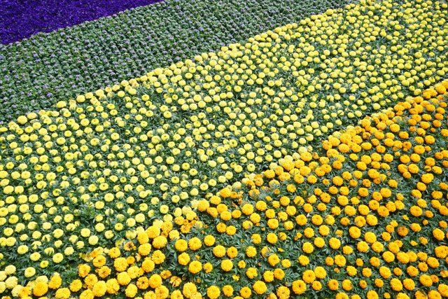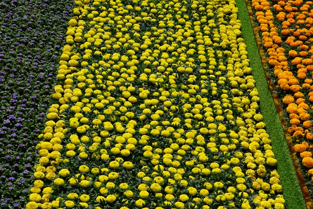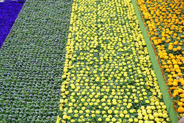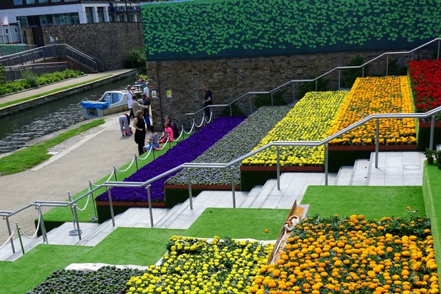 If you look quickly at the carpet of flowers, you might think its the tulip fields in the Netherlands, but no, it’s marigolds, geraniums, ageratum and petunias on the canalside steps at Granary Square, near Kings Cross station in London.
