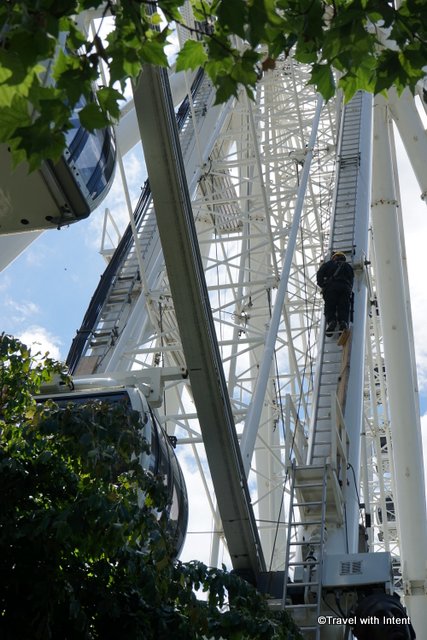 The wheel was stationary when I saw it last week and I discovered that it had been temporarily closed a couple of weeks ago due to a serious fault with the fountains beneath it. But there was a man hard at work on it and the wheel did make a few test moves while I watched.