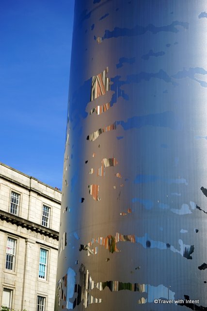 The lower 10 metres of the sculpture is partially polished in an abstract design, based on a core sample of earth and rock formation taken from the ground where the spire stands. This slightly shinier surface catches magical reflections of the people and buildings here on O’Connell Street.