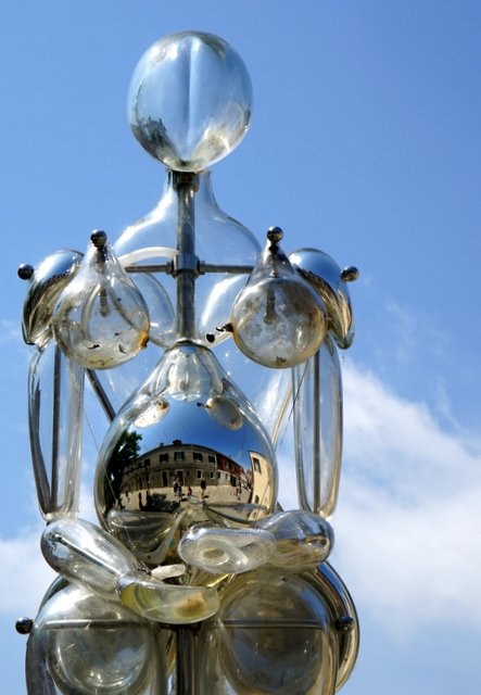 Murano glass can be found the world round, but for the best selections you should visit Murano itself.  Not all of it is beautiful (not to my eye at least) and not all of it is real (Chinese imitations abound).  Much of it is repetitious: beads, balloons and clowns spring to mind.  But there are also some large, striking and unusual public pieces around.  This glass female, with what seem to be four breasts (and a tail too, but you can’t see it in this shot), was a wonderful source of reflections.