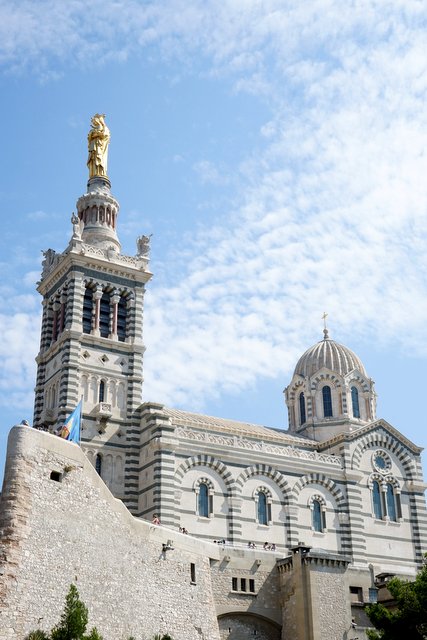 The scale of the building and the unusual black and white stripes bear a striking resemblance to Notre Dame de la Garde, high on the hill above Marseille.