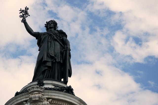 The statue of Marianne, the name traditionally given to the French Republic, has pride of place in the huge pedestrian square that is Place de la République.  It was sculpted by the Morice brothers and was unveiled on Bastille Day, 14 July, of 1885.  She holds an olive branch, the symbol of peace, in her right hand and a tablet inscribed Droits de l’Homme (Human Rights) in her left hand.