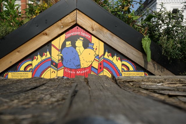 More recently, the disused toilet block in the centre of the square has been transformed into an outdoor art gallery with a roof garden, where trees and edible plants now thrive. The street art is thriving too, with local businesses supporting a regularly changing array of art work. One of my favourite artists to appear in the area is Lispencie who has this on show currently in Stevenson Square: