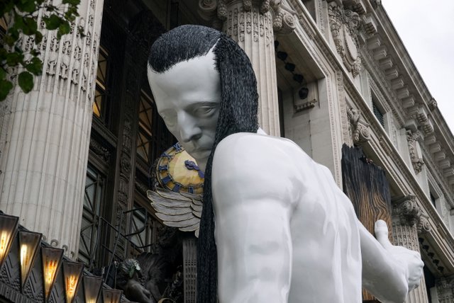 The statue is part of “The World of Rick Owens”, a new collaboration between Rick Owens and Selfridges. He has designed an exclusive 20-piece collection for the collaboration: each item is labelled with an image of the torso statue on a Selfridges-yellow background.