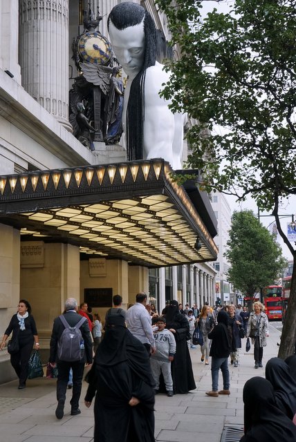 I have to say I don’t know enough about the fashion designer to comment on teh sculpture of him, though he obviously likes it as it appears on his clothing! Burkas are everywhere in London now, not a trend I’m happy to see