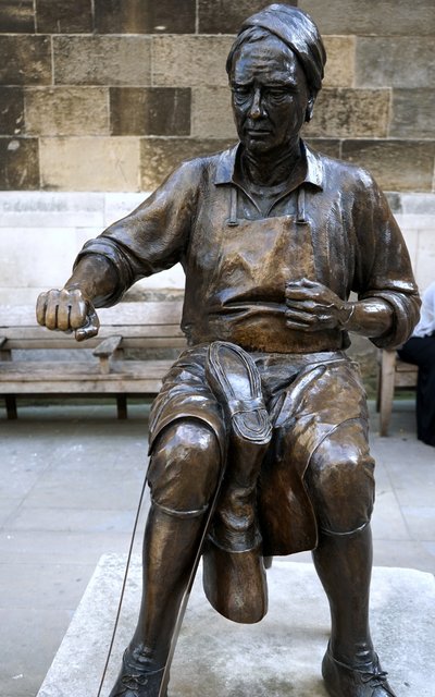 This sculpture of a cordwainer stands in the Ward of Cordwainer in the City of London, the area known for its shoe making back in the Middle Ages. The finest leather was imported from Cordoba in Spain, and this led not just to good shoes, but to the coining of the name for both the area and the trade.