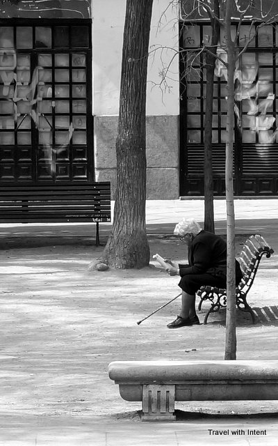 I guess it is not easy to find a solitary scene in big cities like Madrid. In this photo solitude looks like a welcoming experience. Nice B&W shot, Debbie.
