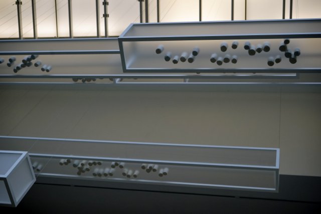 The Turner Contemporary stands in a prominent position on the seafront at Margate. On the ground floor is a large gallery with huge windows that take advantage of the natural light and the stunning view to sea. The current exhibition in this Sunley Gallery is by the artist Edmund de Waal, who grew up in nearby Canterbury. It consists of 286 porcelain vessels in 9 aluminium and plexiglass vitrines, that hand from the ceiling, close to the windows.