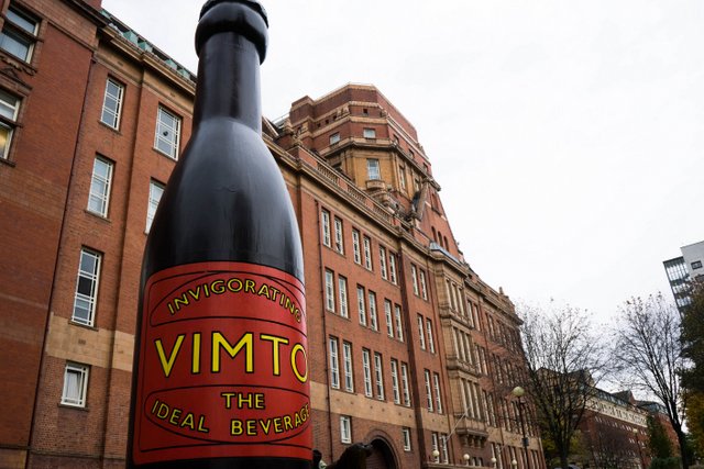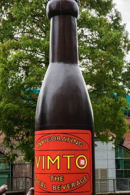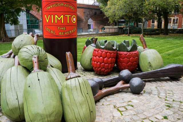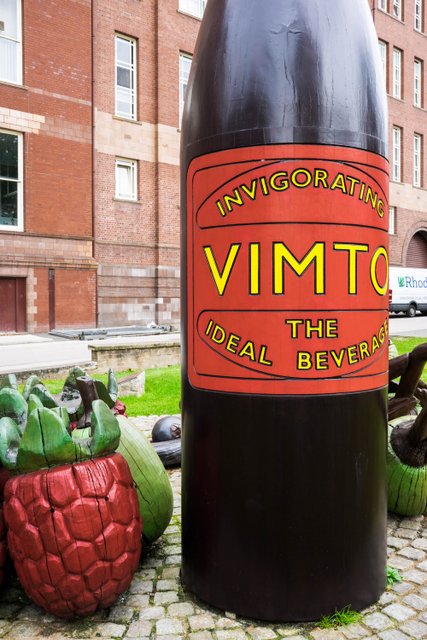In 1992 a monument to the fruity drink was erected at the original production site, now in the university area of Manchester. The giant bottle, grapes, raspberries and blackcurrants were all carved from wood by Kerry Morrison.