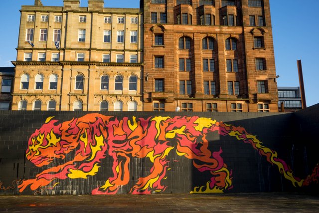Tiger Beer commissioned a number of murals to commemorate 2010 Year of the Tiger. Five of these represented the elements of the Chinese Zodiac – water, earth, wood, fire and metal. The mural below which can still be seen in Glasgow, close to the River Clyde, represents fire.