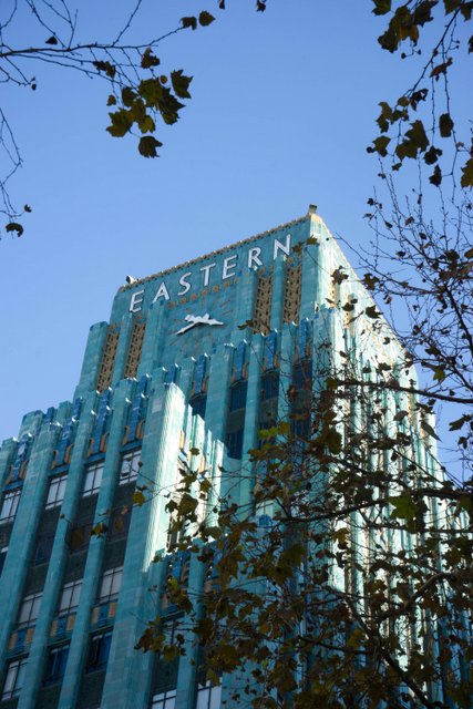 It is impossible to walk past its glimmering turquoise terracotta tiled exterior without admiration.  The vertical columns and copper panels draw the eye upwards towards the towering clock high above.  The clock tower boldly displays the name “Eastern” in neon and is crowned with a central smokestack surrounded by four stylized flying buttresses. The façade is embellished with sunburst patterns, geometric shapes, zigzags, chevrons and stylized animal and plant shapes.