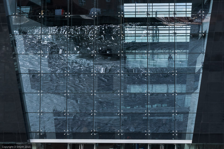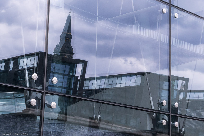 The waters of Copenhagen Harbour reflected in the shiny Black Diamond