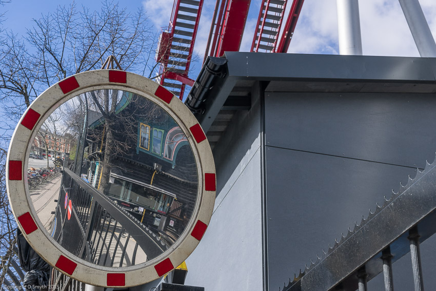 I wouldn’t advise taking a shortcut into the Tivoli Gardens over this vicious fence! But you can get a peek in the conveniently placed mirror up in the air, or just listen to the screams as the roller coaster thunders overhead.