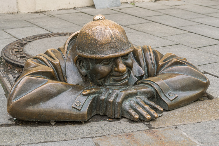 This dapper man with the top hat was a real Bratislavan inhabitant, Ignác Lamár, with something of a sad story.  The grandson of a famous clown of the same name, he is said to have been inspired by his ancestor’s example to bring happiness to the streets of the city. However, his own life was full of sadness – his fiancee died in a concentration camp in World War II and it seems he never recovered from this trauma.  Thereafter, he wandered the streets in top hat and tails, greeting women with the words “I kiss your hand” in German, Hungarian and Slovak and received free food from several of the city’s cafes.
