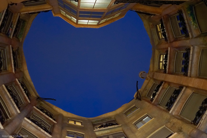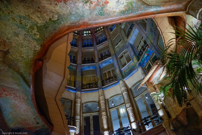 Today, I had planned to bring you some night views of Barcelona from the roof of La Pedrera.  I had booked myself on a night tour before I left home this morning and although I knew the weather had been decidedly damp yesterday, my forecast said only a 3% chance of rain for the afternoon and evening.  I turned up just before the allotted time, as per the ticket instructions, and had the luxury of waiting in the entrance area for a while, admiring the flower-decorated walls and ceiling and gazing at the midnight blue sky.
