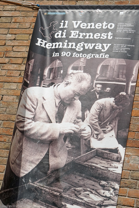 Hemingway was a big fan of Venice, writing in 1948 in a letter to Bernard Berenson, “I’m an old Veneto’s fanatic”. In September of that year, Hemingway and his fourth wife returned to Italy to visit his wartime haunts; the photo above of Hemingway inspecting fish at the Rialto Fish Market is from that visit.