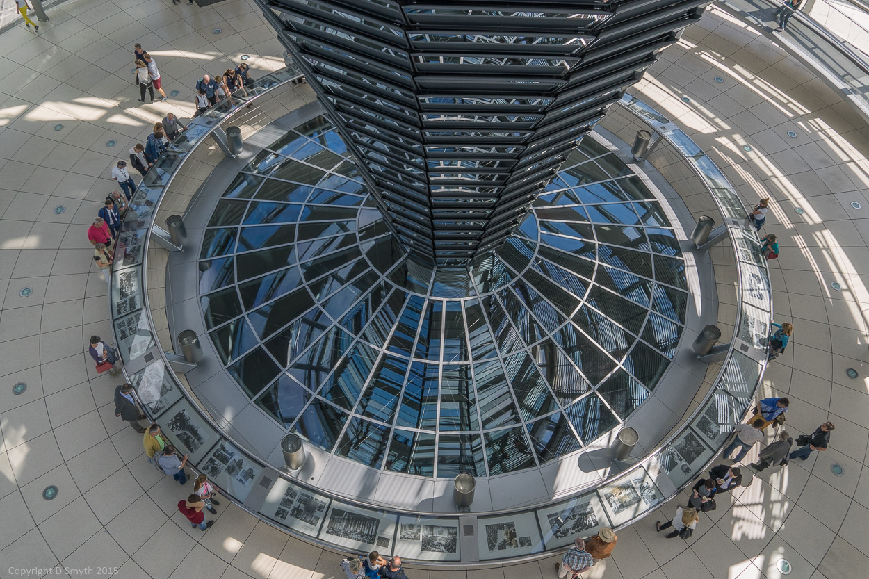 The interior views really do compete for attention with the views across the city, and are probably more vertigo-inducing.  If you peer carefully through the glass at the base of the funnel you can even see people sitting in the plenary chamber below.