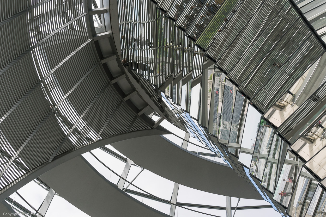 A spiral walkway winds its way up and down the dome, providing great views of both the outside and the inside.  The curved glass, metal framework and a massive metal blind that rotates around the dome in line with the sun, work together to create a real feast for the eye.