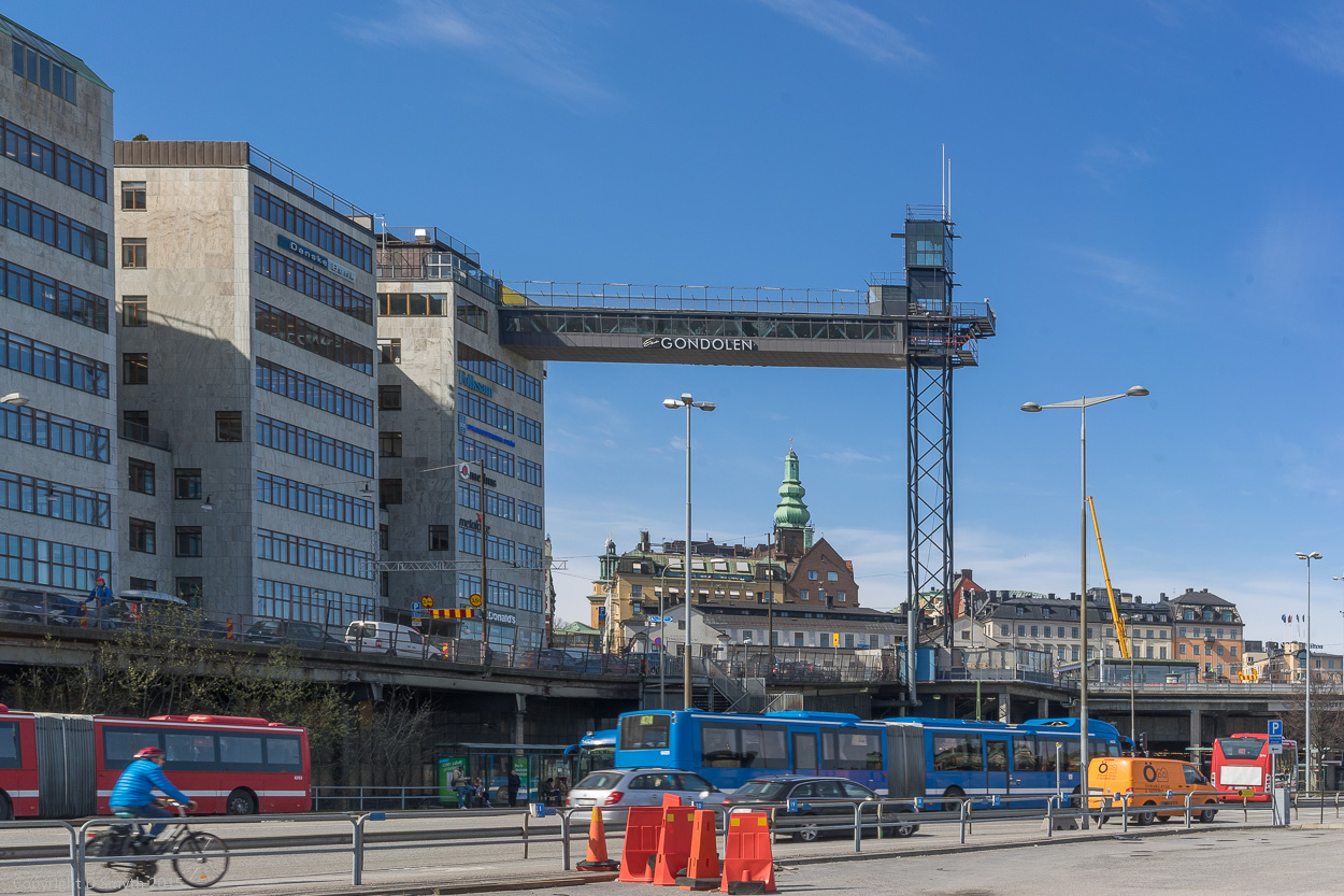 Eric’s vertiginous Gondolen hovers over the lock area (Slussen) of Stockholm. Even from the ground, it simply demands to be looked at, supported as it is by the old Katarina Lift that connected the lock area with the heights of Södermalm.