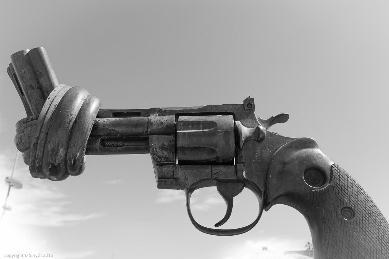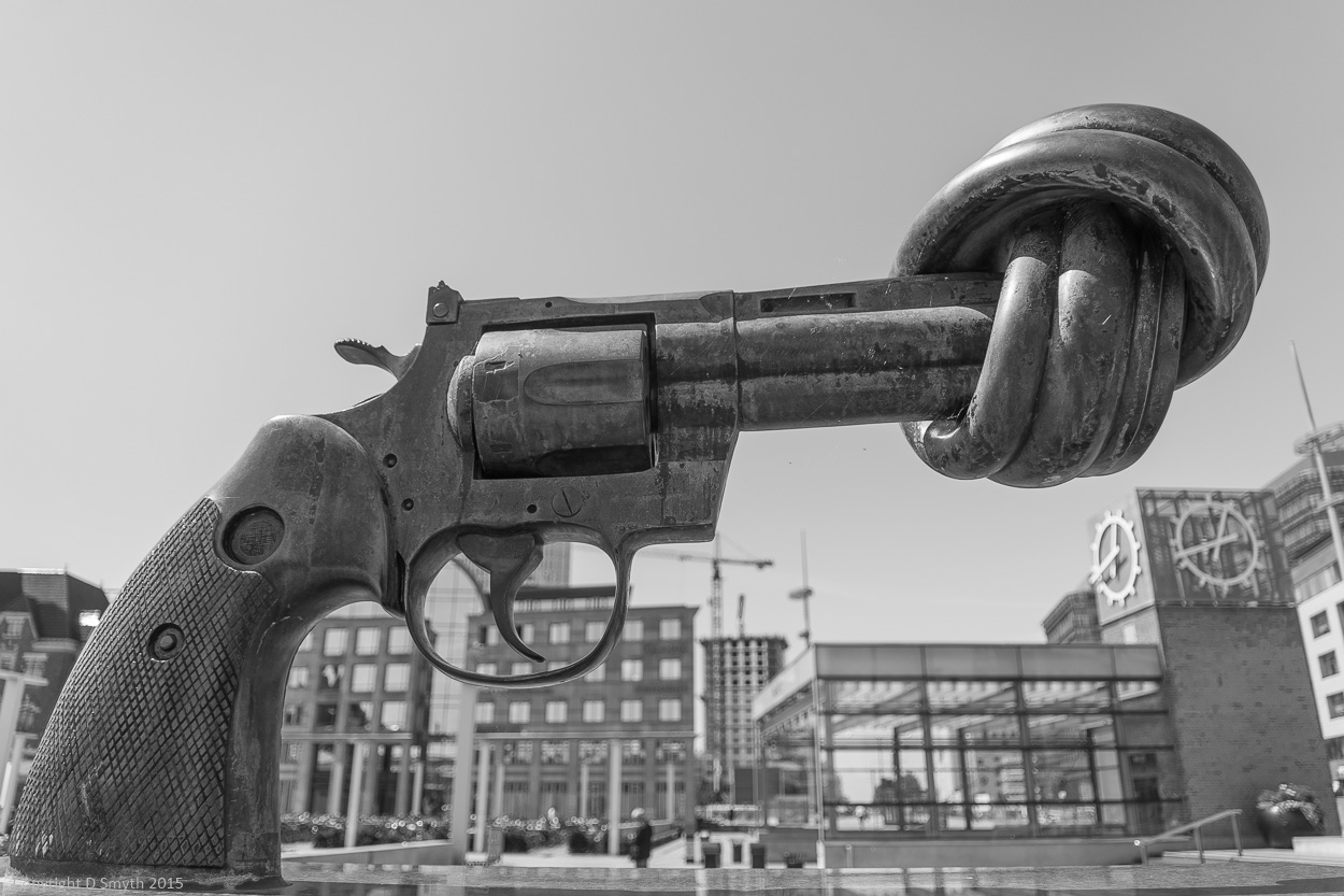 This oversized Colt Python .357 Magnum revolver with a knotted barrel standing outside Malmö Central Station is a sculpture by the Swedish artist Carl Fredrik Reuterswärd. He created this large bronze piece, known as Non-Violence, following the murders of John Lennon and Bob Crane and the sculpture has since become the symbol of The Non-Violence Project, a nonprofit organization promoting social change with violence prevention education programs.