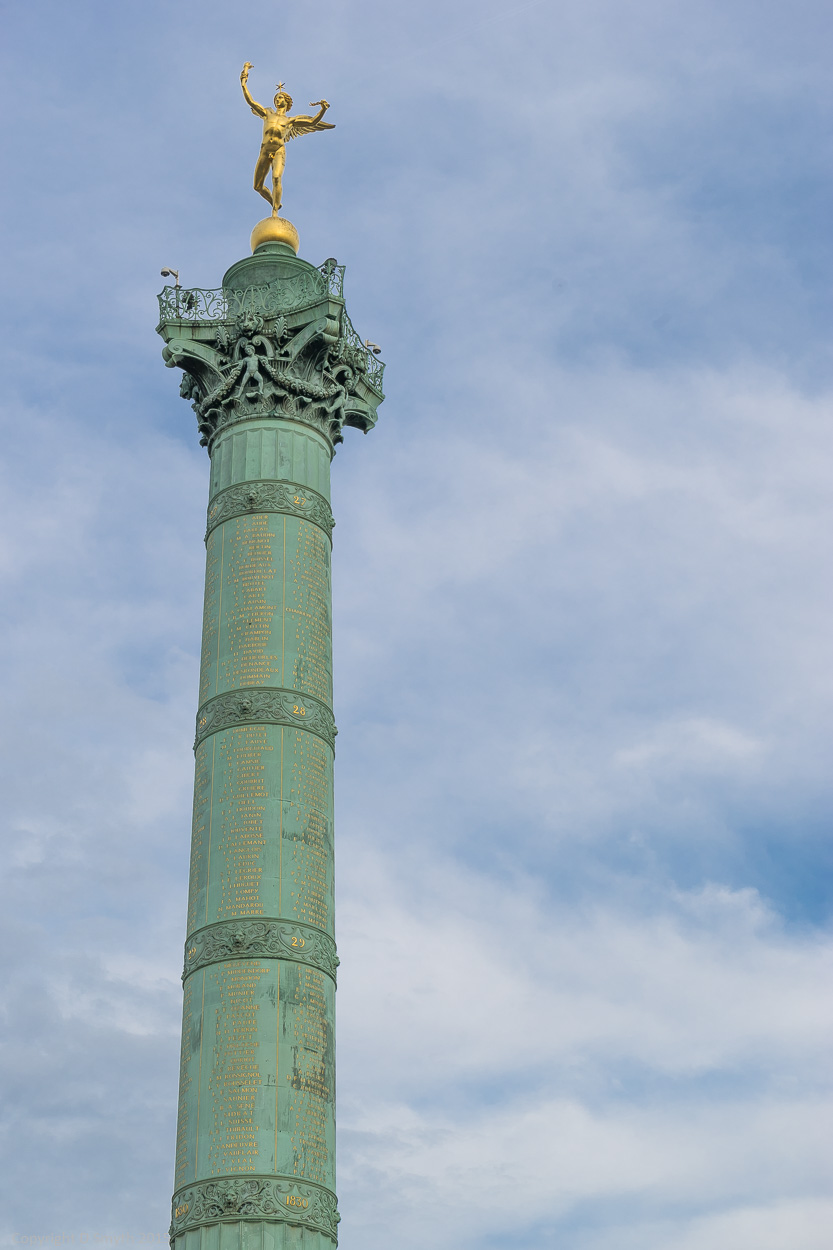 The giant gilded statue that hovers atop the July Column in the Place de la Bastille in Paris, symbolises liberty. The Genie de la Liberté brandishes the torch of civilisation in one hand and and the remains of his broken chains in the other. The 47 metre high column bears the gold engraved names of those who lost their lives during the July 1830 revolution.