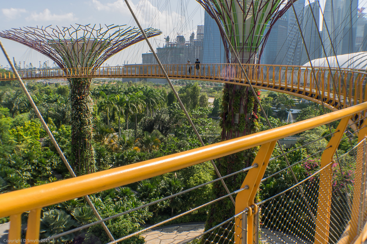 Today’s visit to the Gardens by the Bay was very impressive and the Supertrees there just had to be this week’s topic.  There are 18 of these “trees” in the gardens, 12 of which are grouped together in a grove and are the ones featured in this post.  These concrete and steel structures vary in height, from 25 to 50 metres.  They are effectively vertical gardens, covered in a variety of plants, including bromeliads, orchids and ferns.
