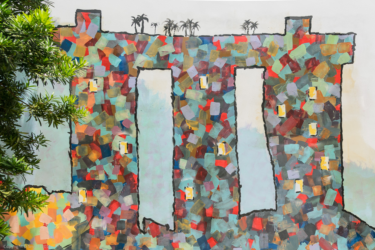 Opened in 2010, this massive structure, with a massive budget to match, comprises a hotel, casino, shopping mall, museum, infinity pool, observation deck, gardens, boardwalk and museum. Its design, a kind of 3-legged pi with a curved ship on top, makes it instantly recognisable. In fact, this is the building that features in the Banda Street murals.