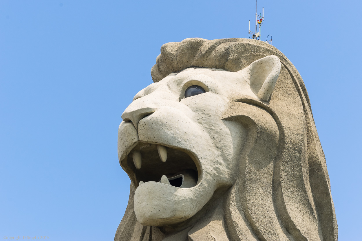 This time it’s the famous merlion, a somewhat artificially manufactured symbol of Singapore. The name combines “mer” meaning the sea, representing Singapore’s origin as a fishing village; and “lion” representing Singapore’s original name, Singapura, or “lion city”. Created by the Tourist Board, it has now become a recognised symbol of the city.