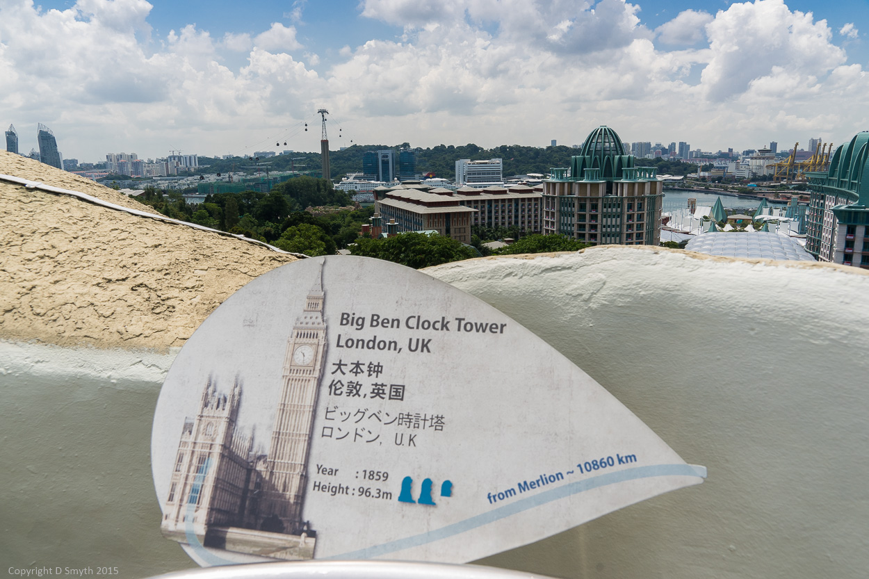 I’m taking you to the large merlion on Sentosa Island. This is an unusual example; for a fee, you can go inside and visit his head! As you enter at the lower level, you are greeted with a few watery montages, reminiscent of Disney’s Little Mermaid. You are then led into a small cinema to watch an animated film about a jolly but rather camp merlion – at this stage, you really will think you are at Disneyworld.