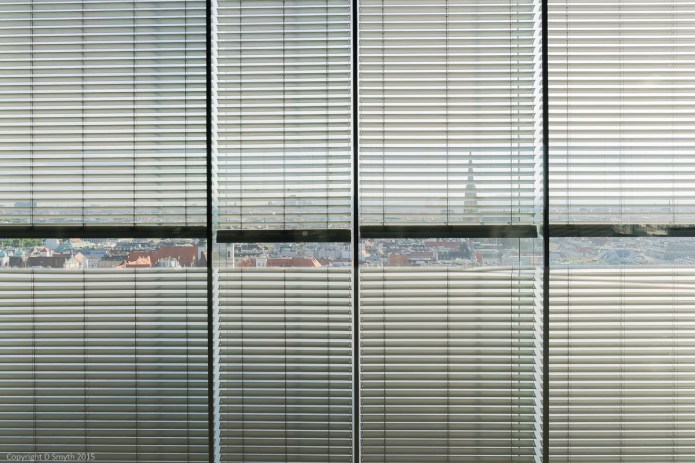 I made a flying visit to Vienna this week and was lucky enough to get back up to the bar atop the Sofitel Stephansdom.  It was a glorious afternoon so the blinds were down, creating somewhat hallucinatory reflections in the smooth surfaces of the bar – the blinds in the bottom half of this shot are a reflection.