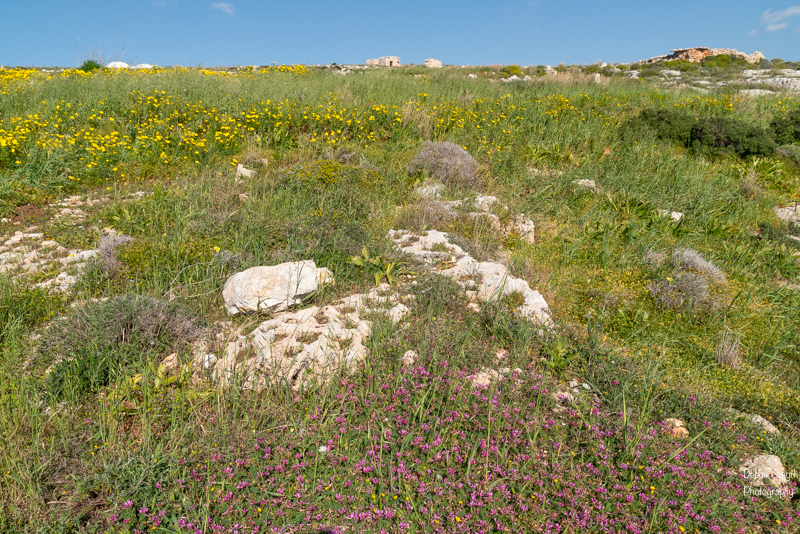 The flora is typically Mediterranean, with some species specific to Malta, including Maltese Spurge and Maltese Fleabane.