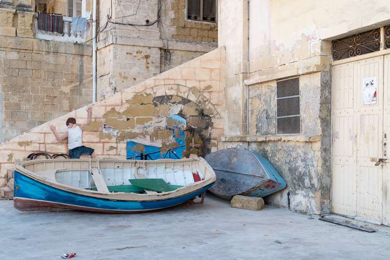 I spotted this young lad clambering up the wall behind the boat as I wandered along the waterfront of Senglea, to catch a ferry back to Valletta. It was hard to tell what was real and what was pretend, but once closer I knew he was art. Closer still, and I found a friend even better hidden.