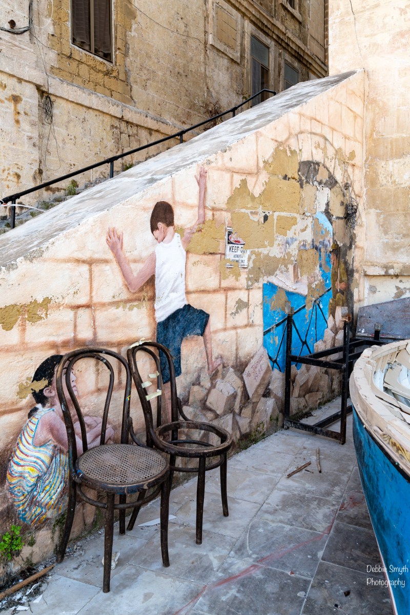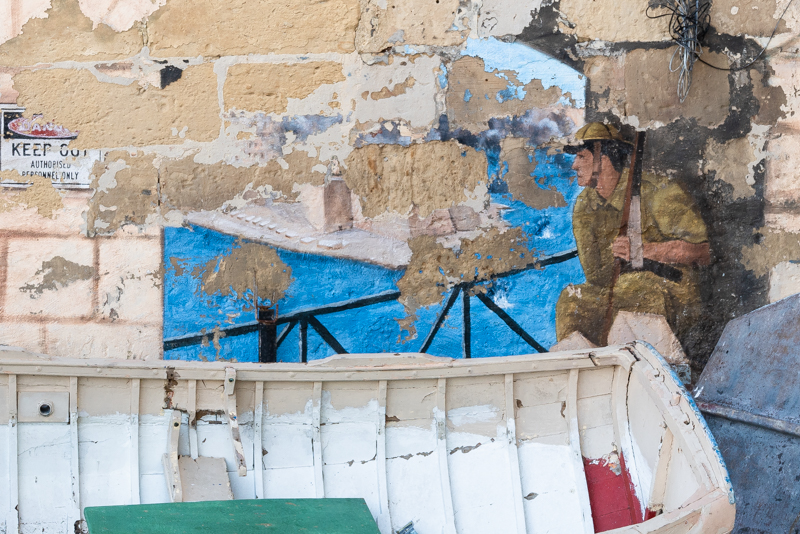 It was a while, though, before I spotted the man well hidden in the corner, perched on the rubble, a soldier protecting the Grand Harbour from attack by Italy and Germany in 1941. The mural was painted by Maltese artist Lewis Zammit in 2013 and has suffered much damage. You can see the detail of the original work here.