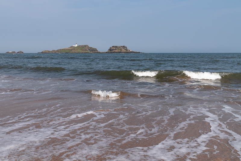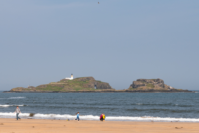 We’ll turn left on the sands, and head west a little. As we saunter along the beach, let’s pause to admire the uninhabited island of Fidra, that lies just off the coast.