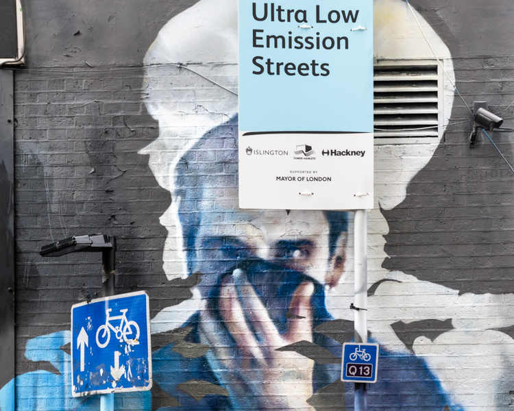His illustration of the impact of pollution on our health, is well positioned at the top of Rivington Street, one of the roads that is included in the Ultra Low Emission Streets (ULEV) project in London. During peak hours, only low emission vehicles are allowed on these streets – no petrol, no diesel, and no old hybrid systems.