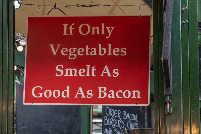 Actually, as a vegetarian I find the smell of bacon rather revolting. (Mind you, I’m not exactly enamoured of the smell of certain veggies either — brussels sprouts, for example.) I do feel sorry for the people who give up meat yet love it, that must be a struggle indeed.